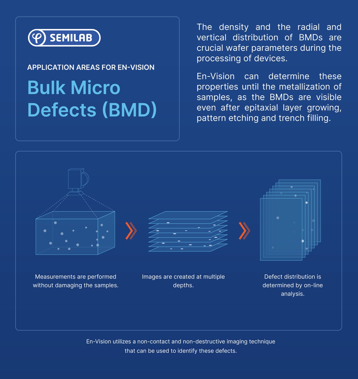During the implantation process of silicon samples, the crystal structures can be damaged and end-of-range defects can remain in the affected volume even after the annealing recovery. With En-Vision, the implantation processes can be monitored to detect these defects and provide detailed information on their classification. With En-Vision system, bulk micro defects (BMDs) can be detected with detailed information on their density and radial and vertical distribution.